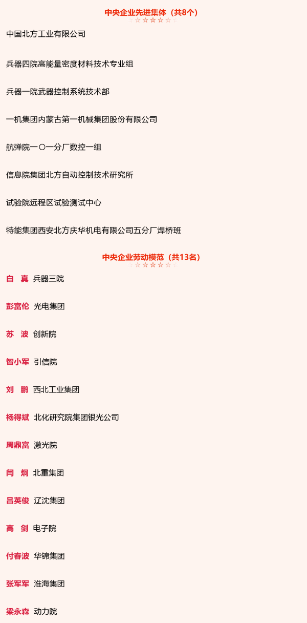 兵器工業(yè)集團(tuán)8個(gè)集體和13名個(gè)人獲中央企業(yè)先進(jìn)集體和勞動(dòng)模范表彰